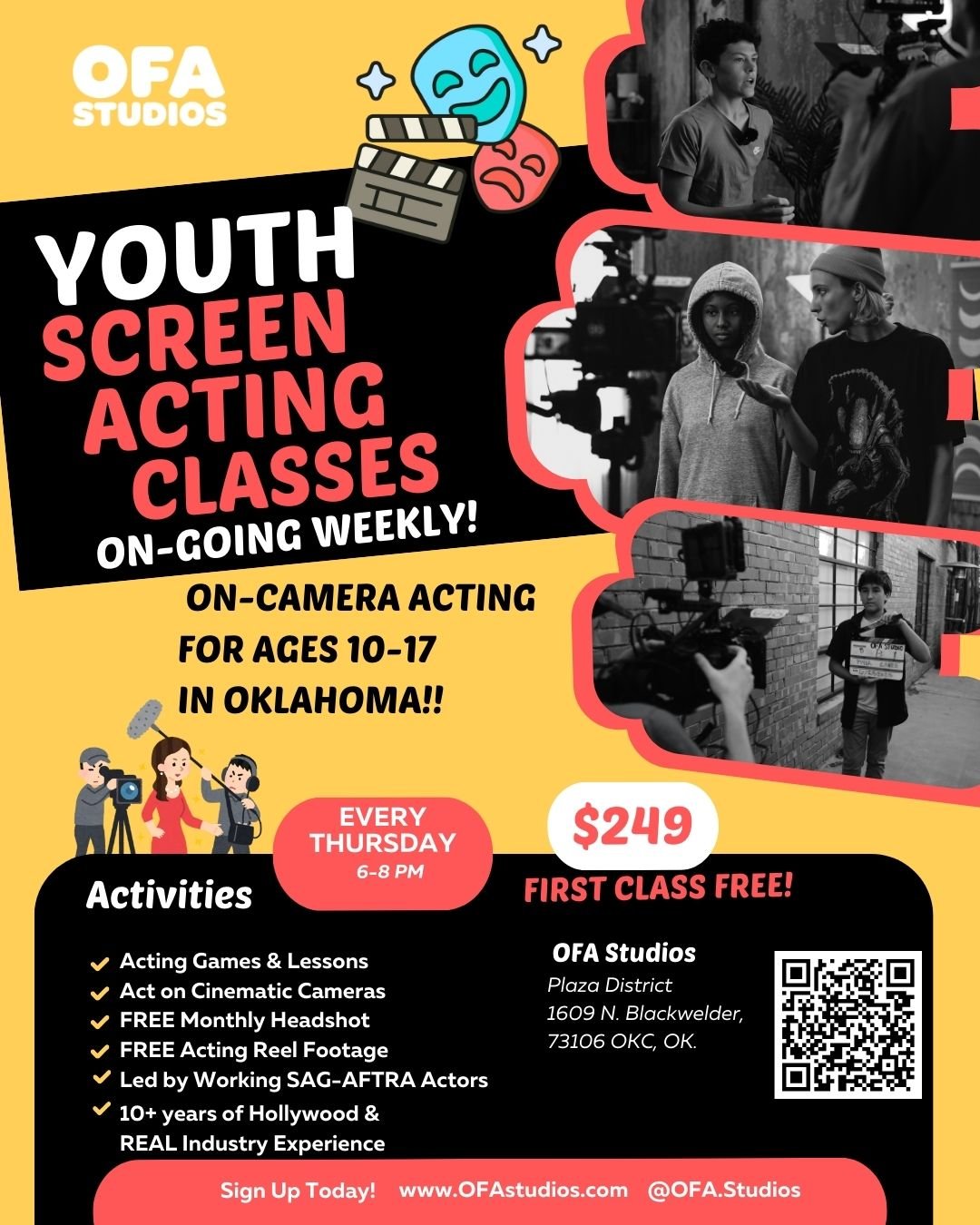 A high-energy, confidence-building acting class for young performers who want to learn real film & TV skills. Students work on camera every week, explore imagination, storytelling, and character, and leave with footage, community, and real growth — the OFA way.